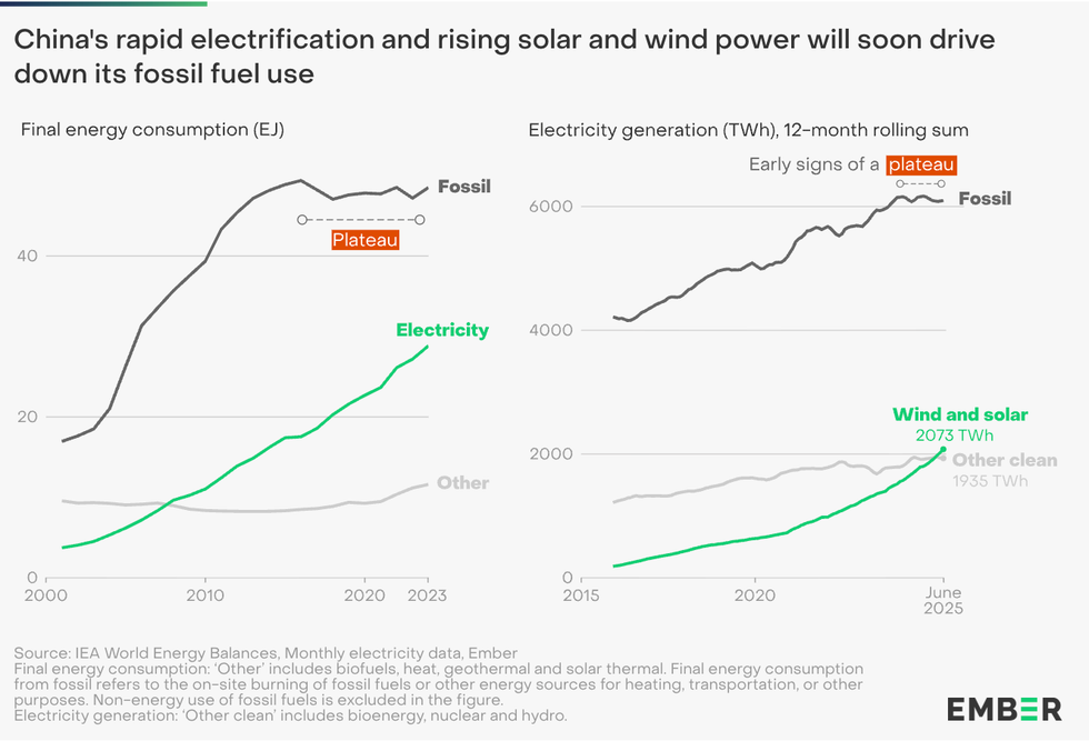 China’s clean energy boom is bringing a global decline in fossil fuel demand into sight amid declines in usage in the buildings, vehicles, and industries of the world’s second-largest economy, according to the think tank Ember’s latest China Energy Transition Review. The report, released Tuesday morning, found that exports of solar panels, batteries, electric vehicles, and heat pumps are soaring, particularly to emerging economies, making the possibility of developing nations making possible an “energy leapfrog” over the coal phase of growth. From 2015 to 2023, China’s end consumption of fossil fuels fell 1.7% across buildings, industry and transport, while electricity use as a replacement rose by 65%. In power generation, fossil output dropped 2% in the first half of 2025 compared to the same period last year, as wind and solar generation soared by 16% and 43%, respectively. Last year alone, Beijing invested $625 billion in clean energy, 31% of the global total.