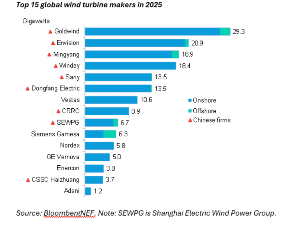 The global wind industry set a record last year, adding 169 gigawatts of turbines throughout 2025, according to the latest analysis from the consultancy BloombergNEF. The 38% surge compared to 2024 came as the momentum in the sector shifted to Asia. Chinese companies made up eight of the top 10 global wind turbine suppliers, the report found, as domestic installations in the People’s Republic reached an all-time high. India, meanwhile, edged out the U.S. and Germany as the world’s second largest market after China. Of all global wind additions, 161 gigawatts, or 95%, were onshore turbines, mostly spurred on by the domestic boom in China. Not only did that same building blitz help Beijing-based Goldwind hold onto its top spot as the world’s leading turbine supplier, it vaulted Chinese manufacturers into the next five slots in the global ranking. “Thanks to stable long-term policy support, wind installations over the past decade have become increasingly concentrated in mainland China,” Cristian Dinca, wind associate at BloombergNEF and lead author of the report, said in a statement. “Chinese manufacturers consistently top the global rankings. They benefitted particularly in 2025, as companies and provinces rushed to commission projects ahead of power market reforms and to meet targets set out in the Five Year Plan.”