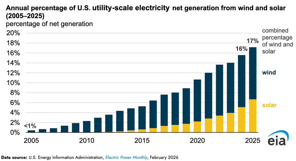 In Washington, the newly-inaugurated Trump administration spent much of 2025 hacking away at federal policies supporting the buildout of wind and solar power. Across the country, however, the U.S. generated a record 17% of its electricity from the two renewables, with wind producing the larger portion. Between 2024 and 2025, wind power’s output increased by 3%, according to analysis by the Energy Information Administration. But solar boomed, with utility-scale projects soaring 35% in 2025 from the previous year.