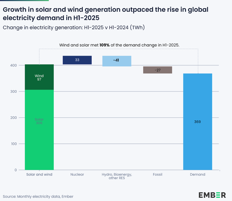 Solar and wind outpaced the growth of global electricity demand in the first half of 2025, vaulting renewables toward overtaking coal worldwide for the first time on record, according to analysis published Tuesday by the research outfit Ember. This year’s growth resulted in a small overall decline in both coal and gas-fired power generation, with India and China seeing the most notable reductions, despite the United States and Europe ratcheting up fossil fuel usage. “We are seeing the first signs of a crucial turning point,” Malgorzata Wiatros-Motyka, a senior electricity analyst at Ember, said in a statement. “Solar and wind are now growing fast enough to meet the world’s growing appetite for electricity. This marks the beginning of a shift where clean power is keeping pace with demand growth.”