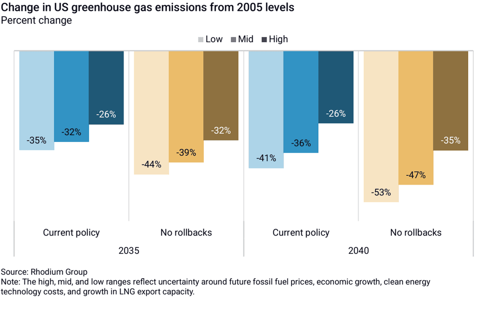 The United States’ output of planet-heating pollution is on track to continue double-digit declines through 2040, even if the Trump administration successfully eliminates all the policies it’s targeting to cut greenhouse gas emissions. That’s according to the latest assessment from the Rhodium Group consultancy. A new report published Wednesday morning found that U.S. emissions are set to decline by 26% to 43% relative to 2005 levels in 2040. While that sounds like a significant drop, it’s a “meaningful shift” away from Rhodium’s estimates last year, which showed a steeper decline of 38% to 56%. In all, as Heatmap’s Emily Pontecorvo wrote, the Trump administration’s policies could halve U.S. emissions cuts.