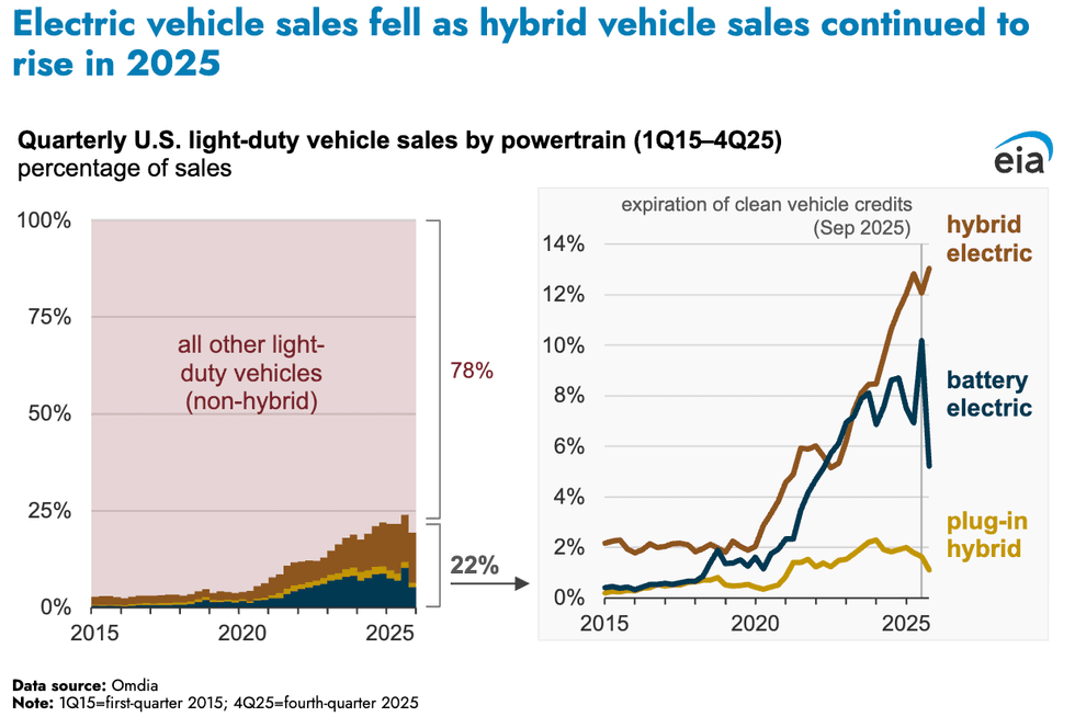 Roughly 22% of light-duty vehicles sold last year in the U.S. were hybrid and battery electric, up from 20% in 2024. While sales of battery-powered vehicles have fallen, demand for hybrids has only increased, according to estimates from the research firm Omdia that the U.S. Energy Information Administration highlighted in a new analysis. Electric vehicles accounted for just 2% of all registered light-duty vehicles on U.S. roads in 2024, the most recent year for which annual data is available. Sales for 2025 will show a spike, especially around September when Americans rushed to cash in on electric vehicle tax credits before Trump’s phaseout took effect.