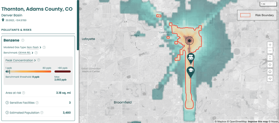 The Methane Risk Map is a web tool with clickable markers representing individual methane super-emitter events throughout the U.S. Selecting one opens up a heatmap and information panel that shows the concentration of benzene, methane, and other pollutants present in that particular plume, the modeled distance each one traveled during the event, the demographics of the population exposed, and whether there were any sensitive facilities, such as schools or hospitals, in the exposure pathway. It also gives the date the emission event occurred and what kind of equipment it came from, if available, such as a well or a tank.