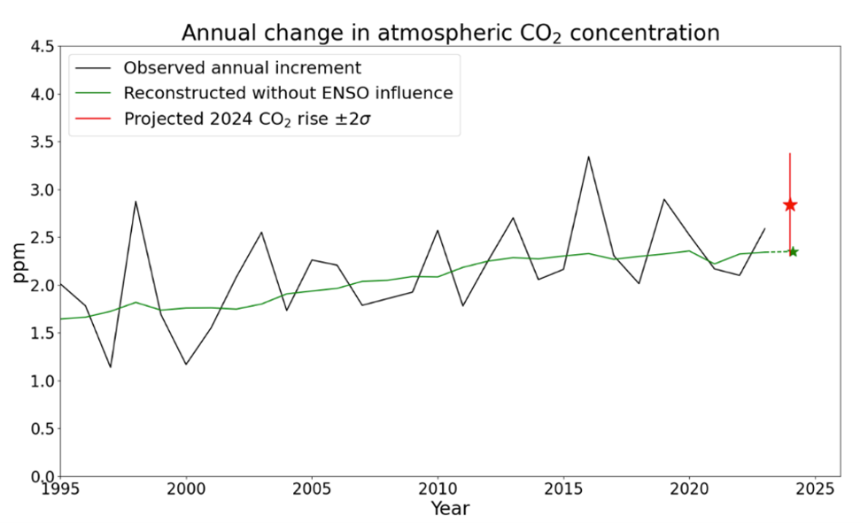 2024 is expected to be a record year for carbon dioxide emissions, according to the U.K.’s Met Office. The emissions increase could push atmospheric CO2 levels beyond the threshold for limiting global warming to 1.5 degrees Celsius above pre-industrial levels. Driving the surge in emissions is the continued use of fossil fuels, plus the El Niño weather pattern. But even without El Niño, “human-induced emissions would still cause the CO2 rise in 2024 to be on the absolute limits of compliance with the 1.5°C pathways,” said the Met Office’s Richard Betts. Scientists say surpassing 1.5 degrees in warming could trigger tipping points and irreversibly alter the global climate system.