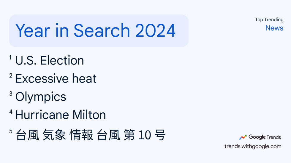 “Excessive heat” was the second-highest ranking news topic to be Googled worldwide in 2024. “Hurricane Milton” ranked fourth.