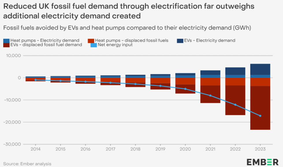 A new report from the energy think tank Ember looks at how the uptake of electric vehicles and heat pumps in the U.K. is affecting oil and gas consumption. It found that last year the country had 1.5 million EVs on the road, and 430,000 residential heat pumps in homes, and the reduction in fossil fuel use due to the growth of these technologies was equivalent to 14 million barrels of oil, or about what the U.K. imports over a two-week span. This reduction effect will be even stronger as more and more EVs and heat pumps are powered by clean energy. The report also found that even though power demand is expected to rise, efficiency gains from electrification and decarbonization will make up for this, leading to an overall decline in energy use and fossil fuel consumption.