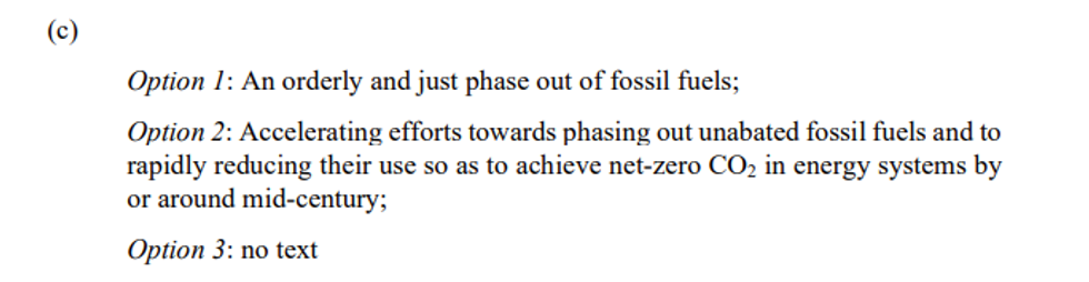 But according to climate policy advocate and lawyer Natalie Jones, China, India, and the Arab Coordination Group of countries have proposed deleting paragraph 35 entirely. That means no mention of a phase out whatsoever. But paragraph 35 contains other important commitments, too, including tripling renewable energy capacity by 2030, scaling up low-emissions technologies like green hydrogen, and ending permits for new unabated coal power plants. So scrapping this paragraph altogether could well and truly torpedo the potential for this COP to produce bold, ambitious, and unambiguous climate action.
