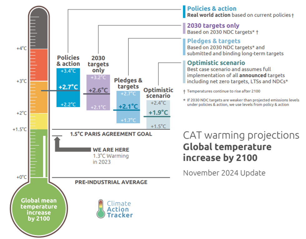 A new report published this morning finds that projections for temperature increases through 2100 remain stagnant for the third year in a row. The research group Climate Action Tracker found that the world is likely to warm by 2.7 degrees Celsius (4.9 degrees Fahrenheit) by the end of the century. But there’s a 50% chance the number could be lower – or higher. By 2030, temperatures are now expected to rise somewhere between 1.9 and 2.6 degrees Celsius (3.4 and 4.7 degrees Fahrenheit), a slight uptick thanks to “minimal progress” from governments in strengthening emissions targets. “Mixed signals from the political space are canceling each other out and clearly hindering progress in climate action,” the report said. “COP29 must be an enabling COP, delivering concrete outcomes to translate the pledges made last year into real-world, real-economy results.”