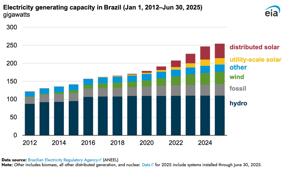 Brazil has long benefited from an electrical system built around hydropower plants. But distributed solar is now the fastest-growing source of new generation in the South American country. Distributed solar capacity grew from less than 1 gigawatt in 2018 to 40 gigawatts this year as of June, according to data from the U.S. Energy Information Administration.