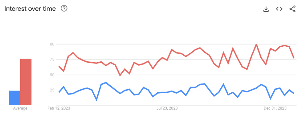 Carmakers in the United Kingdom can no longer use the words “zero emissions” in ads to describe their electric vehicles. The U.K.’s advertising watchdog, the Advertising Standards Authority (ASA), says the claim is misleading for consumers because it ignores emissions from manufacturing and charging. If carmakers want to use the term, they must find a way to explain this nuance. The precedent-setting move is part of a bigger crackdown on greenwashing – the ASA has also banned misleading ads from oil groups and airlines, the Financial Times reported. But it comes at a time when carmakers are striving to increase their EV sales to avoid hefty fines: As of this year, fully-electric cars must make up at least 22% of new cars sales in the U.K. If a company misses that target, it will be fined £15,000 for every non-compliant vehicle. So the question is how much the words “zero emissions” really matter for sales. BMW, for example, uses the term in Google ads. But a quick look at Google Trends shows “EVs” (in red) is a far more popular search term than “zero emissions” (in blue), at least in the U.K.: