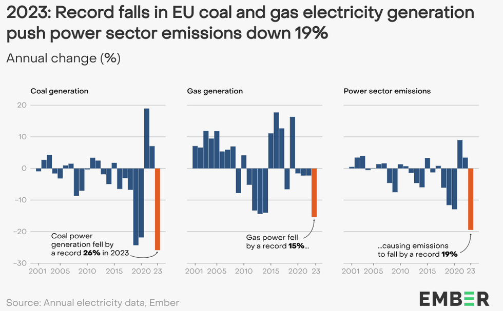 The European Union’s power sector is undergoing a “monumental shift” away from fossil fuels before our eyes, according to a new report from energy think-tank Ember. In 2023, wind power generation in the bloc surpassed that of gas plants for the first time. Compared to 2022, fossil fuel power generation fell by almost 20% overall, with electricity from coal plants plummeting by 26% and gas down 15%. Greenhouse gas emissions from the power sector fell by 19% as a result, more than the huge reduction seen during the pandemic. Ember added that the EU’s power-sector emissions are now almost half their 2007 peak levels. “Fossil fuels are playing a smaller role than ever as a system with wind and solar as its backbone comes into view,” said Sarah Brown, Ember’s Europe program director.