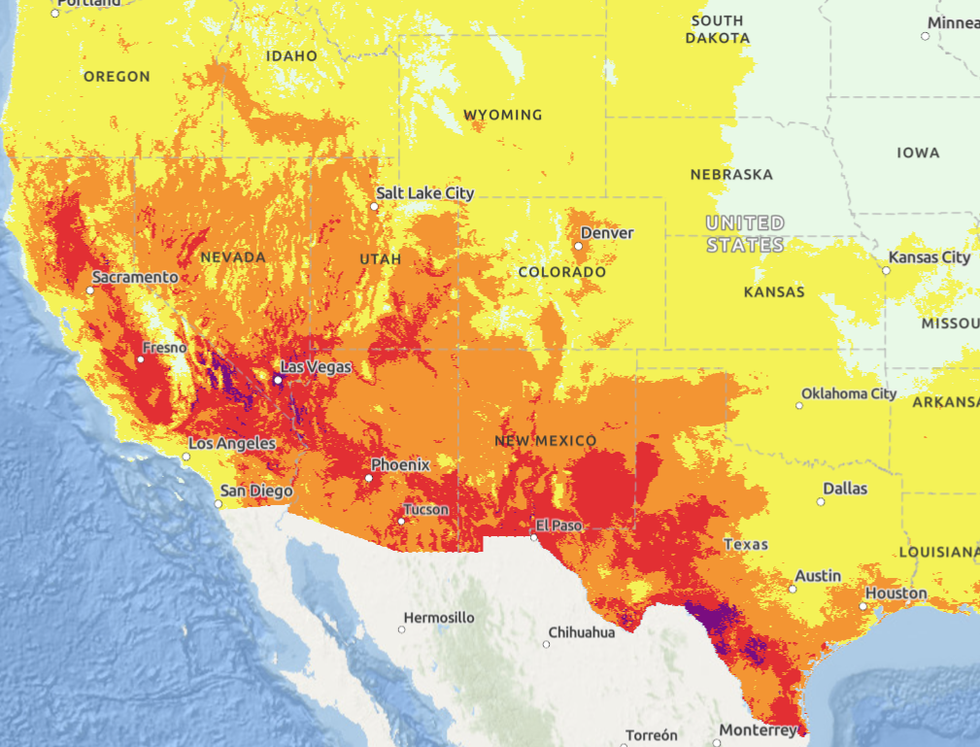 Temperatures across much of the American Southwest are between 20 and 30 degrees Fahrenheit higher than usual for this time of year, according to the National Weather Service. Residents in California, New Mexico, Nevada, Arizona, and Texas are roasting under a heat dome that has settled on the region and will likely peak in severity today. In Phoenix, where temperatures will hit 111 degrees Fahrenheit today, all fire department vehicles are being kitted out with large ice bags in which people suffering from heat stroke can be submerged to lower their temperatures. In California’s Death Valley, the mercury will hit 120 degrees today. The heat wave is expected to boost emissions from California’s power sector as customers crank up their air conditioners. Below is a snapshot of the region today from the NWS HeatRisk tool. Regions in red are experiencing “major” heat-related impacts; purple regions are under extreme heat conditions.