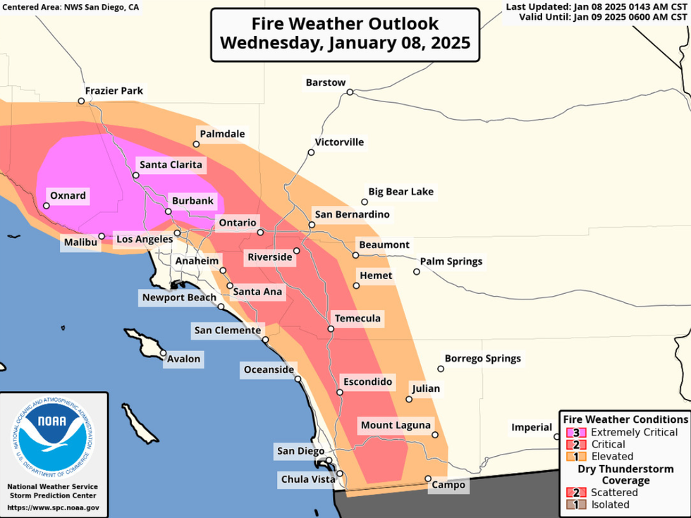 Southern California usually gets some rain over the colder months, but just 0.29 inches of rain has fallen in L.A. since May of last year. On top of that, the area saw record-breaking heat over the summer, so conditions are exceptionally dry. “Locally record hot summer followed by a near-record dry fall followed by the strongest wind event in 14 years,” said Anthony Edwards, a meteorologist at the San Francisco Chronicle. “Energized power lines strung across a landscape that is home to tens of millions of people. Disaster recipe.” Some firefighters reported hydrants were not supplying water. The NWS issued a warning for extremely critical fire weather for Wednesday. Some 200,000 people are without power. “Hell of a way to start a new year,” Gov. Newsom said.
