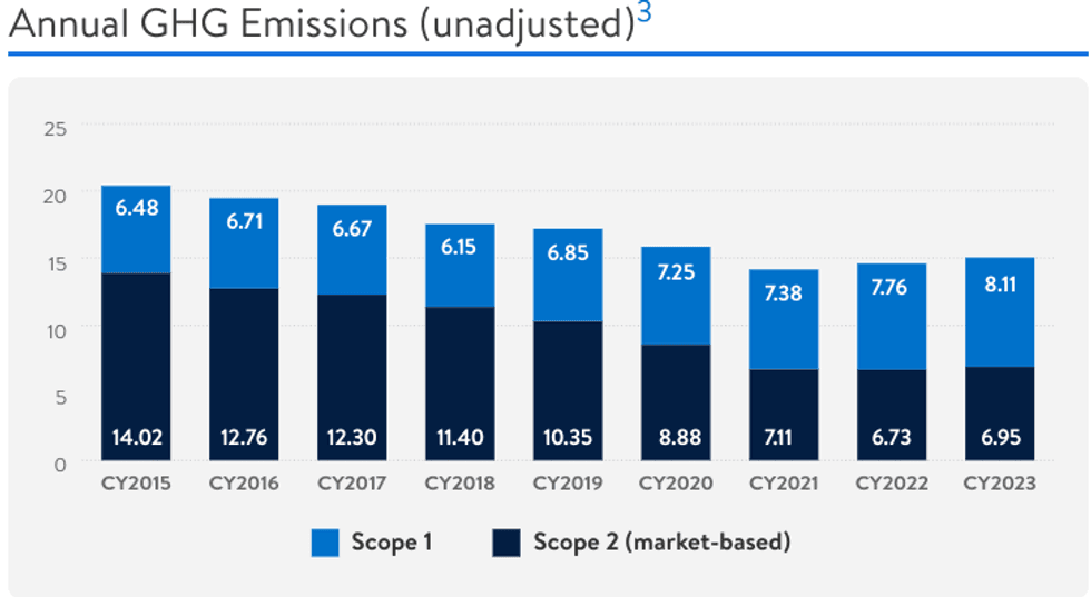 Walmart, the world’s largest retailer, does not expect to meet its 2025 or 2030 emissions targets, and is putting the blame on policy, infrastructure, and technology limitations. The company previously pledged to cut its emissions by 35% by next year, and 65% by the end of the decade. Emissions in 2023 were up 4% year-over-year.