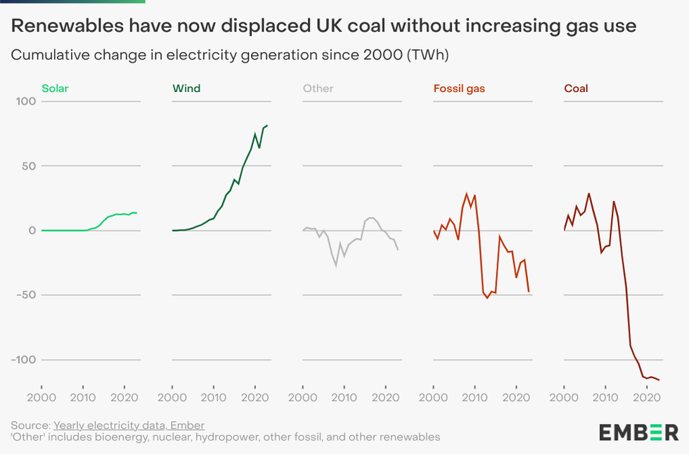 The United Kingdom was home to the world’s first coal-fired power plant, which opened in 1882. Today, it became the first G7 country to phase out coal as a source of electricity with the closure of its last coal-fired plant. As recently as 2012, nearly 40% of the country’s electricity came from coal. But since then, coal has seen a rapid decline. Fifteen coal power plants have shut down or switched fuels, and wind and solar power generation have soared. As a result, carbon emissions from the U.K.’s power sector have fallen by 74%, according to a report from energy think tank Ember. “U.K. policies have incentivised the rapid deployment of renewable energy over the last decade, while simultaneously tightening restrictions on high polluting coal power plants,” the report said. Wind power in particular grew by 315% from 2012 to 2023. What’s more, the move away from coal has happened even without a big shift to natural gas: