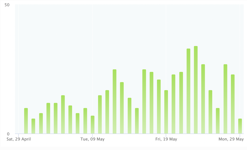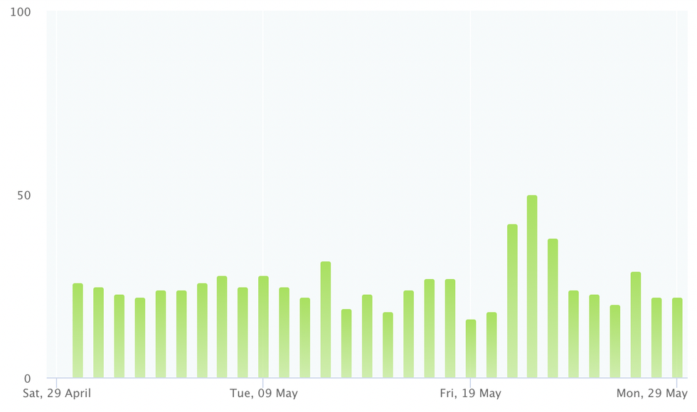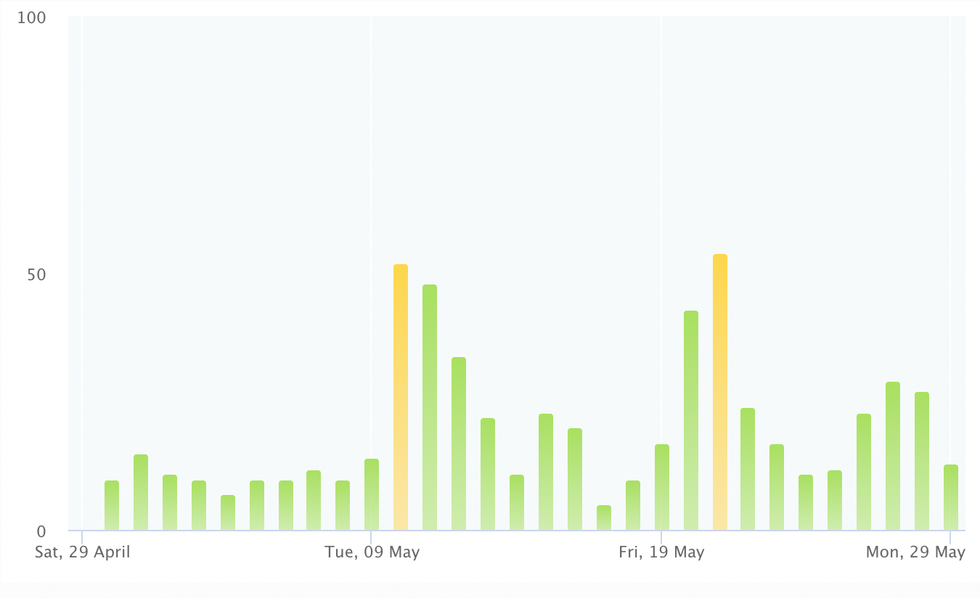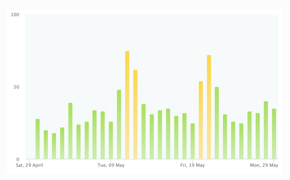 Here’s what the historic AQI has looked like in New York since late April (the yellow spikes mark smoky days):