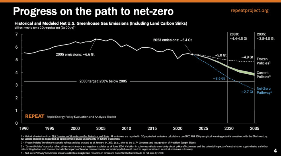 With climate-skeptic Donald Trump set to retake the White House in January, many are wondering what his policies will mean for U.S. greenhouse gas emissions. He’s likely to walk back pollution rules on cars and power plants, repeal some parts of the Inflation Reduction Act, boost oil and gas drilling, and pull out of the Paris Agreement. Jesse Jenkins, who leads the Princeton ZERO Lab and is co-host of Heatmap’s Shift Key podcast, said projected emissions will indeed be higher than they would under current policies, but “since Trump cannot repeal grants already awarded or tax credits already provided to date, and it is unlikely that every provision in IRA will be repealed,” they probably will remain lower than Jenkins’ so-called Frozen Policies scenario, which assumes no new climate policies since January 2021.