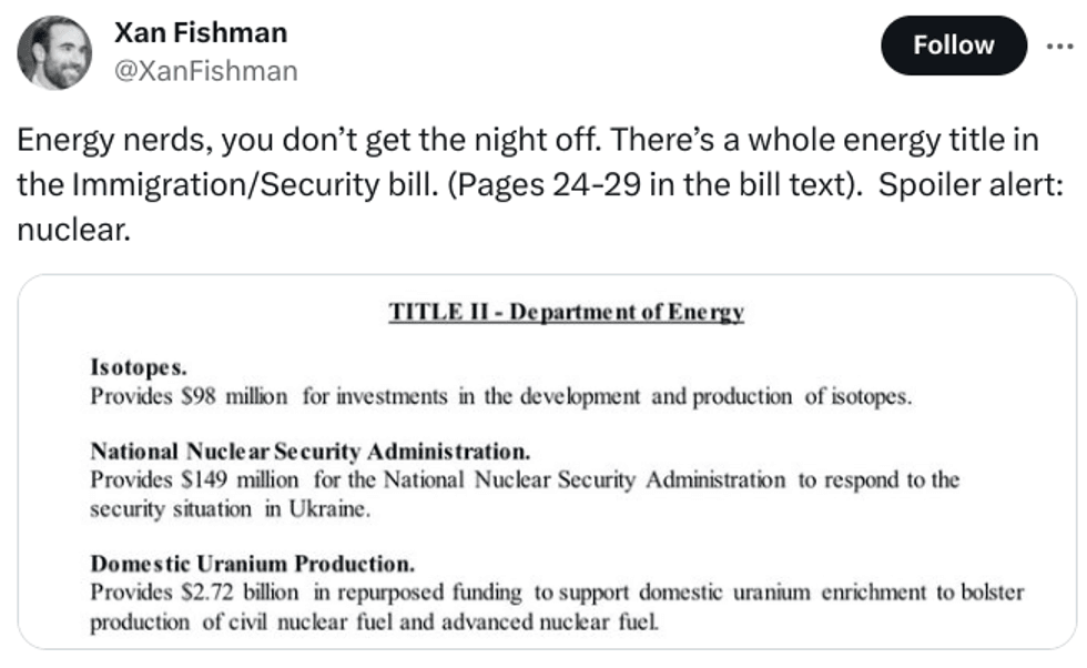 Senators on Sunday unveiled a long-awaited immigration bill aimed at reducing illegal border crossings. The measure also sends additional aid money to Ukraine, Israel, and Taiwan. One eagle-eyed energy expert also spotted some energy funding in the text: