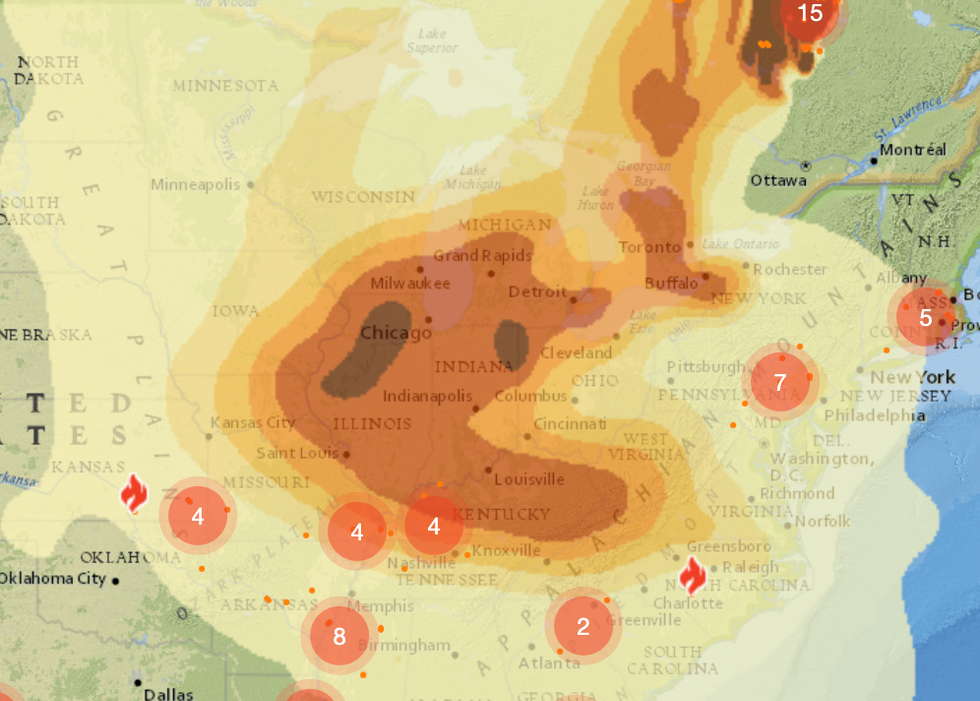 Smoke has to go somewhere, though, and it’ll blow straight out of the Midwest … and into the Ohio River Valley. Air quality alerts have been issued for Indiana and the Louisville metro area (where it is forecast to be “unhealthy for all groups”), lasting through Wednesday, the Louisville Courier Journal reports. Haze has settled over Cincinnati, too, with alerts issued for sensitive groups. According to the FireSmoke Canada model, poor air quality could linger through at least Thursday morning.