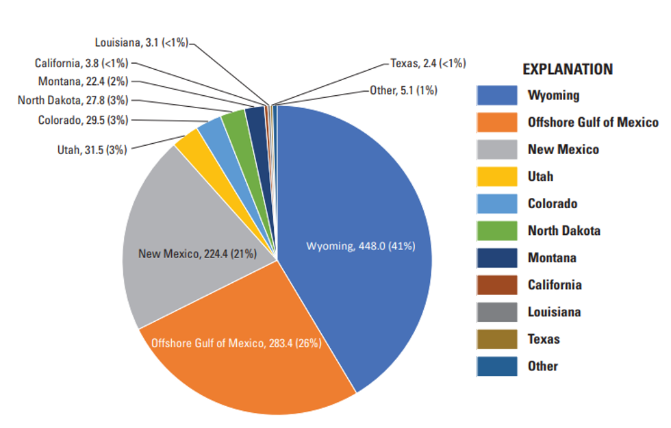 Greenhouse gas emissions from U.S. federal lands peaked in 2009 and have been mostly falling ever since, according to a report from the U.S. Geological Survey. Federal lands make up nearly 30% of all the nation’s land. In 2009, annual emissions from fossil fuel extraction and use on these lands reached 1,430.9 million metric tons of CO2 equivalent, but had fallen to 1,118.9 million metric tons in 2022. Emissions saw a particularly steep drop in 2020, likely linked to the pandemic, and have been rising, but it’s not clear if the upward trend will continue. Wyoming is a major emitter: Its federal land CO2 emissions in 2022 made up 41% of the national total.