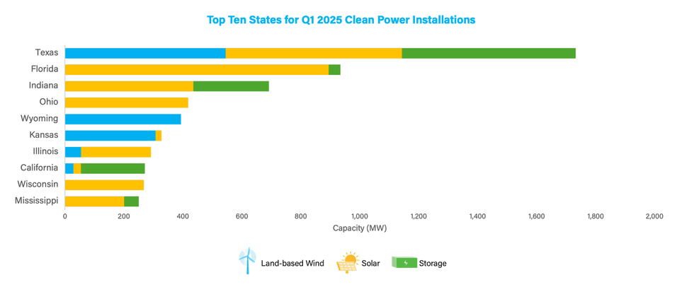 The U.S. installed 7.4 gigawatts of utility-scale solar, wind, and energy storage in the first three months of 2025 — the second-strongest quarter on record behind only Q1 of 2024, the American Clean Power Association reports.