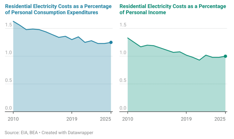 Total residential electricity costs as a fraction of personal expenditure came out to 1.25%, according to new data from the Lawrence Berkeley National Laboratory. That would be near an all-time low, but slightly above 2024 levels. Total residential electricity costs as a fraction of total income was also near an all-time low, at 1%. Once again, that metric was also flat in recent years with a slight increase in 2025.