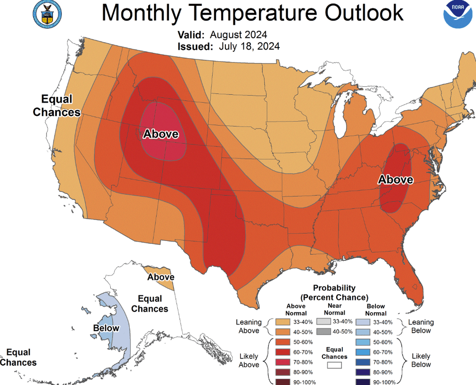 “If you like this summer’s heat, I have some good news for you,” quipped climatologist Brian Brettschneider after seeing the National Oceanic and Atmospheric Administration’s monthly temperature and precipitation outlook for August. It’s expected to be hotter than normal across the vast majority of the contiguous United States next month. That’s looking especially certain for the north-central Rockies (Wyoming, Colorado, and Utah) and the Central Applachians (West Virginia and the Carolinas). As for rain, it’ll likely be dryer than normal out West, and wetter than normal in the Southeast.
