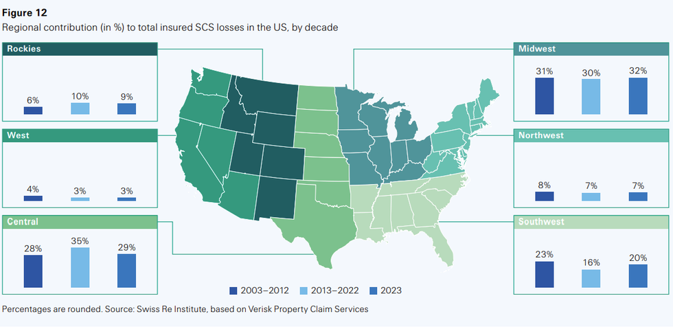 The main reason losses were so high was the sheer frequency with which “medium severity” disasters occurred. These are events that cost between $1 billion and $5 billion, and they’re on the rise. Severe thunderstorms (also called severe convective storms, or SCS) have become “the second largest loss-making peril” behind tropical cyclones. The Midwest accounted for the highest percentage of insured losses from severe thunderstorms in the U.S. last year:
