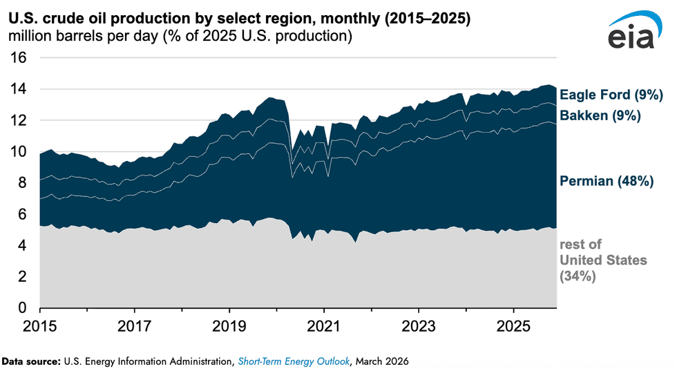U.S. production of crude, on the other hand, surged by 3%, or 350,000 barrels per day, in 2025. That set a new annual record of 13.6 million barrels per day, the EIA found in a separate analysis. If that’s “drill, baby, drill” in action, then the catchphrase deserves an asterisk indicating that the drilling is taking place in the same locations as before. The number of active rigs per month in the lower 48 states was 5% less than in 2024, and 1% fewer wells were drilled. But efficiency improvements at existing wells resulted in an increase of crude.