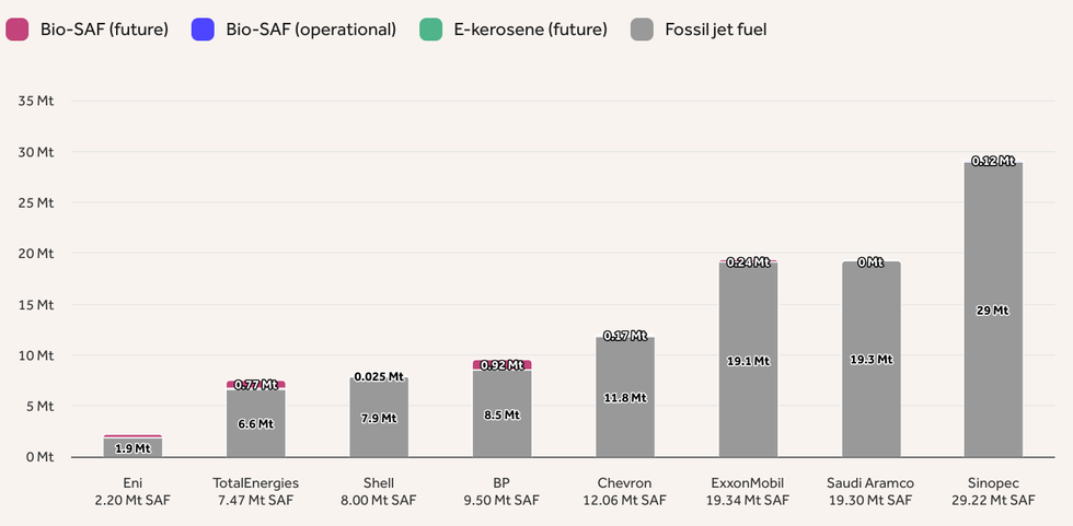 The aviation industry is relying on “sustainable” aviation fuel – or SAF – to help it lower its carbon footprint. But a new report finds airlines aren’t using enough of the stuff to make any meaningful difference. The report, from Brussels-based advocacy group Transport and Environment, ranks 77 major global airlines and airline groups on their use of and commitment to SAF using a points scale of 0 to 100 and found that none of them scored above 61 points, “highlighting how much progress airlines still need to make.” Most airlines failed to get above 24 points. SAF makes up about 1% of global aviation fuel use, Reuters reported. It is more expensive than fossil fuel-based kerosene and there isn’t much of it to go around. The report points to a lack of investment in SAF from oil producers. Below is a graph showing oil giants’ estimated 2023 fuel production. You can just about see the SAF if you squint.