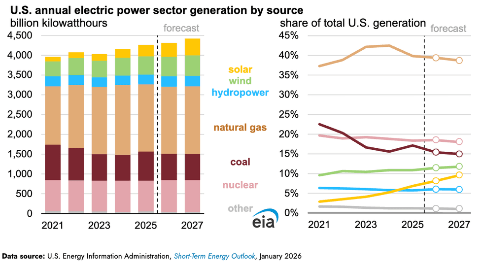 Electricity generation is set to grow 1.1% this year and 2.6% in 2027, according to the latest short-term energy outlook report from the federal Energy Information Administration. Despite the Trump administration’s attacks on the industry, solar power will provide the bulk of that growth. The U.S. is set to add 70 gigawatts of new utility-scale solar in 2026 and 2027, representing a 49% increase in operating solar capacity compared to the end of 2025. While natural gas, coal, and nuclear combined accounted for 75% of all generation last year, the trio’s share of power output in 2027 is on track to slip to 72%. Solar power and wind energy, meanwhile, are set to rise from about 18% in 2025 to 21% in 2027.