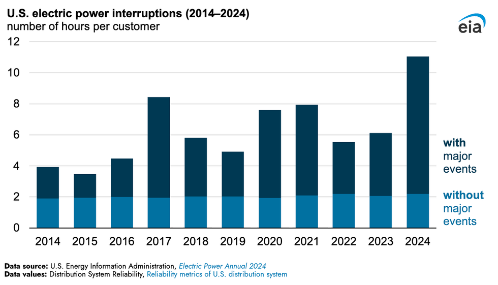 The average American spent a combined 11 hours without electricity last year as a result of extreme weather, worse outages than during any previous year going back a decade. That’s according to the latest analysis by the U.S. Energy Information Administration. Blackouts attributed to major events averaged nearly nine hours in 2025, compared to an average of roughly four hours per year in 2014 through 2023. Major hurricanes accounted for 80% of the hours without electricity in 2024.