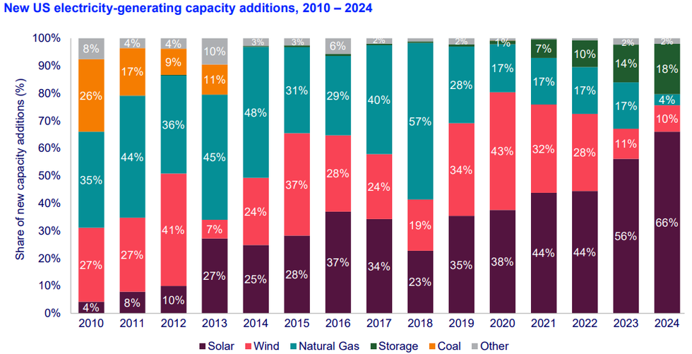 The U.S. installed nearly 50 gigawatts of new solar power capacity last year, up 21% from 2023, according to a new report from the Solar Energy Industries Association (SEIA) and Wood Mackenzie. That’s a record, and the largest annual grid capacity increase from any energy technology in the U.S. in more than 20 years. Combined with storage, solar represents 84% of all new grid capacity added in 2024.