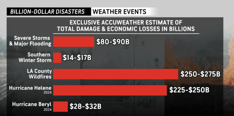 The severe weather outbreak that has brought tornadoes, extreme rainfall, hail, and flash flooding to states across the central U.S. over the past week has already caused between $80 billion and $90 billion in damages and economic losses, according to a preliminary estimate from AccuWeather. The true toll is likely to be costlier because some areas have yet to report their damages, and the flooding is ongoing. “A rare atmospheric river continually resupplying a firehose of deep tropical moisture into the central U.S., combined with a series of storms traversing the same area in rapid succession, created a ‘perfect storm’ for catastrophic flooding and devastating tornadoes,” said AccuWeather’s chief meteorologist Jonathan Porter. The estimate takes into account damages to buildings and infrastructure, as well as secondary effects like supply chain and shipping disruptions, extended power outages, and travel delays. So far 23 people are known to have died in the storms. “This is the third preliminary estimate for total damage and economic loss that AccuWeather experts have issued so far this year,” the outlet noted in a release, “outpacing the frequency of major, costly weather disasters since AccuWeather began issuing estimates in 2017.”