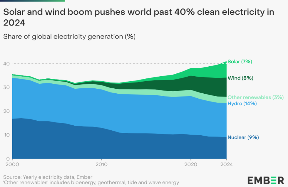 Low-emission energy sources accounted for 41% of global electricity generation in 2024, up from 39.4% in 2023, according to energy think tank Ember’s annual Global Electricity Review. That includes renewables as well as nuclear. If nuclear is left out of the equation, renewables alone made up 32% of power generation last year. Overall, renewables added a record 858 terawatt hours, nearly 50% more than the previous record set in 2022. Hydro was the largest source of low-carbon power, followed by nuclear. But wind and solar combined overtook hydro last year, while nuclear’s share of the energy mix reached a 45-year low. More solar capacity was installed in 2024 than in any other single year.