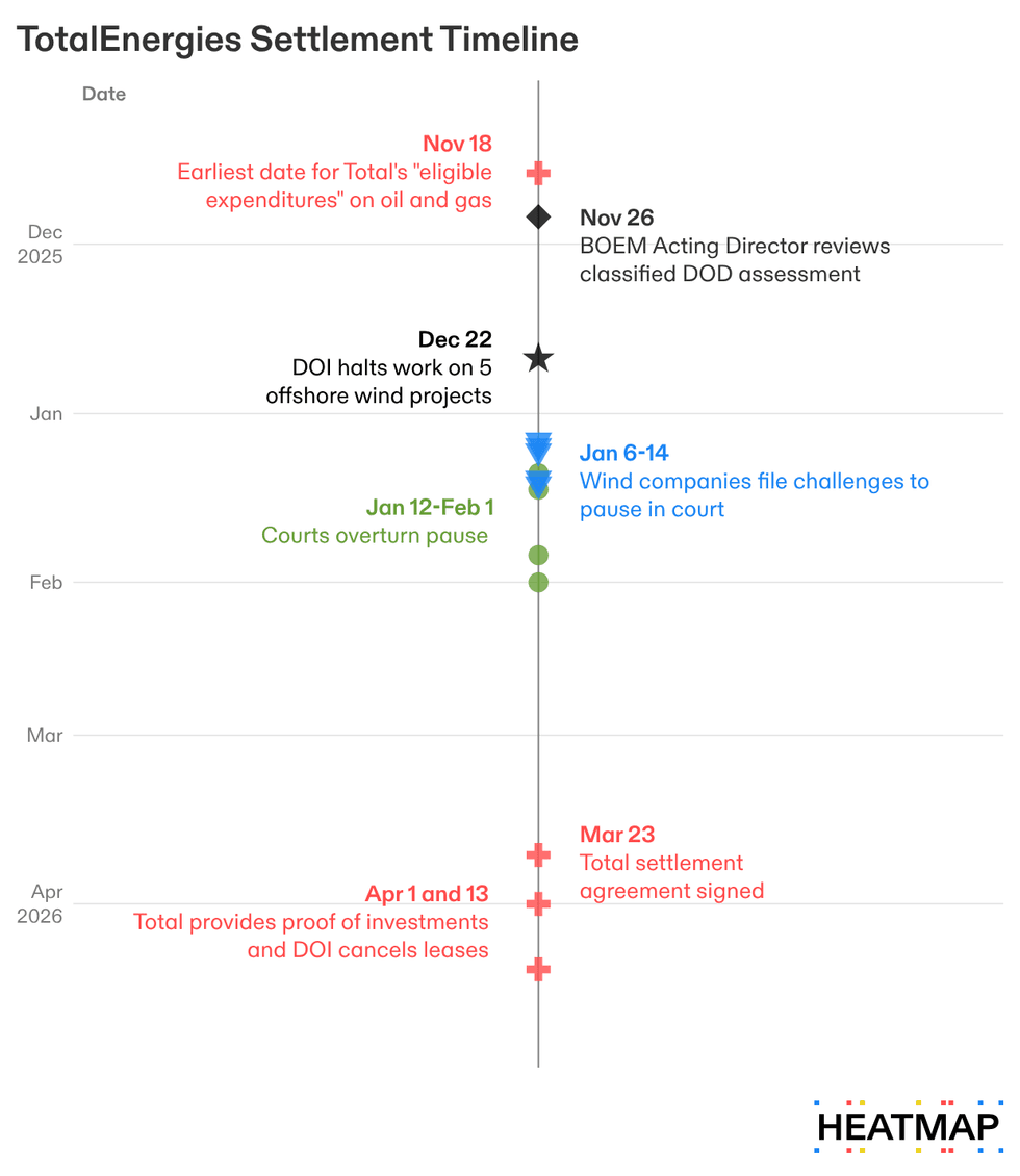 The opening section of the settlement tells a story about the circumstances that led to this unusual deal. The Department of Defense had “raised classified national security concerns” about the leases, it says, referring to the classified reports that Interior Secretary Doug Burgum cited when he halted five offshore wind projects last December. The Interior Department “would have” suspended TotalEnergies’ leases indefinitely, too, the settlement says, “similar to” that December suspension order on the five wind projects. Had the agency done that, however, Total “would have claimed breach of contract” and filed a lawsuit in the U.S. Court of Federal Claims. The agency determined that canceling the lease, instead, was “in the public interest.”
