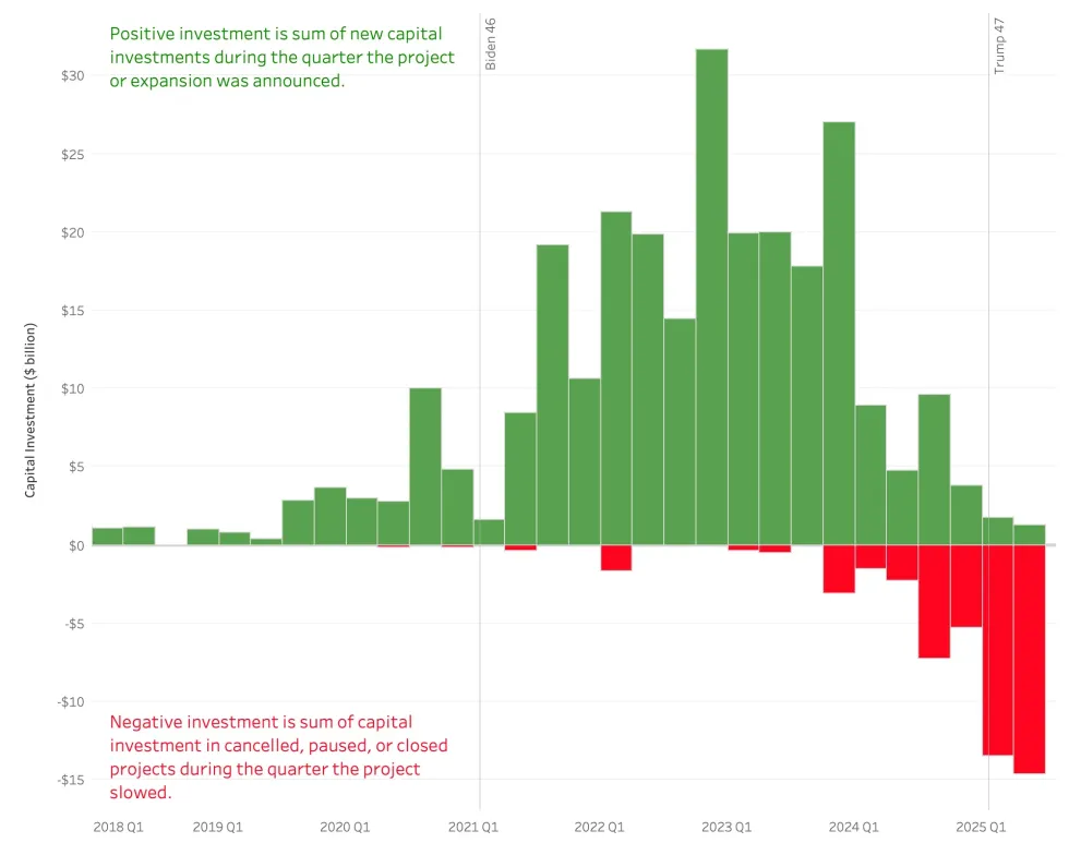 At least 34 factories or mineral refineries totaling more than $30 billion in investment have been paused, delayed, or canceled since Trump took office. That’s according to a new report from researchers at Wellesley College. “When you look at the projects that are slowing down, it’s all up and down the supply chain,” Jay Turner, an environmental studies professor who leads the database, told Heatmap’s Robinson Meyer.