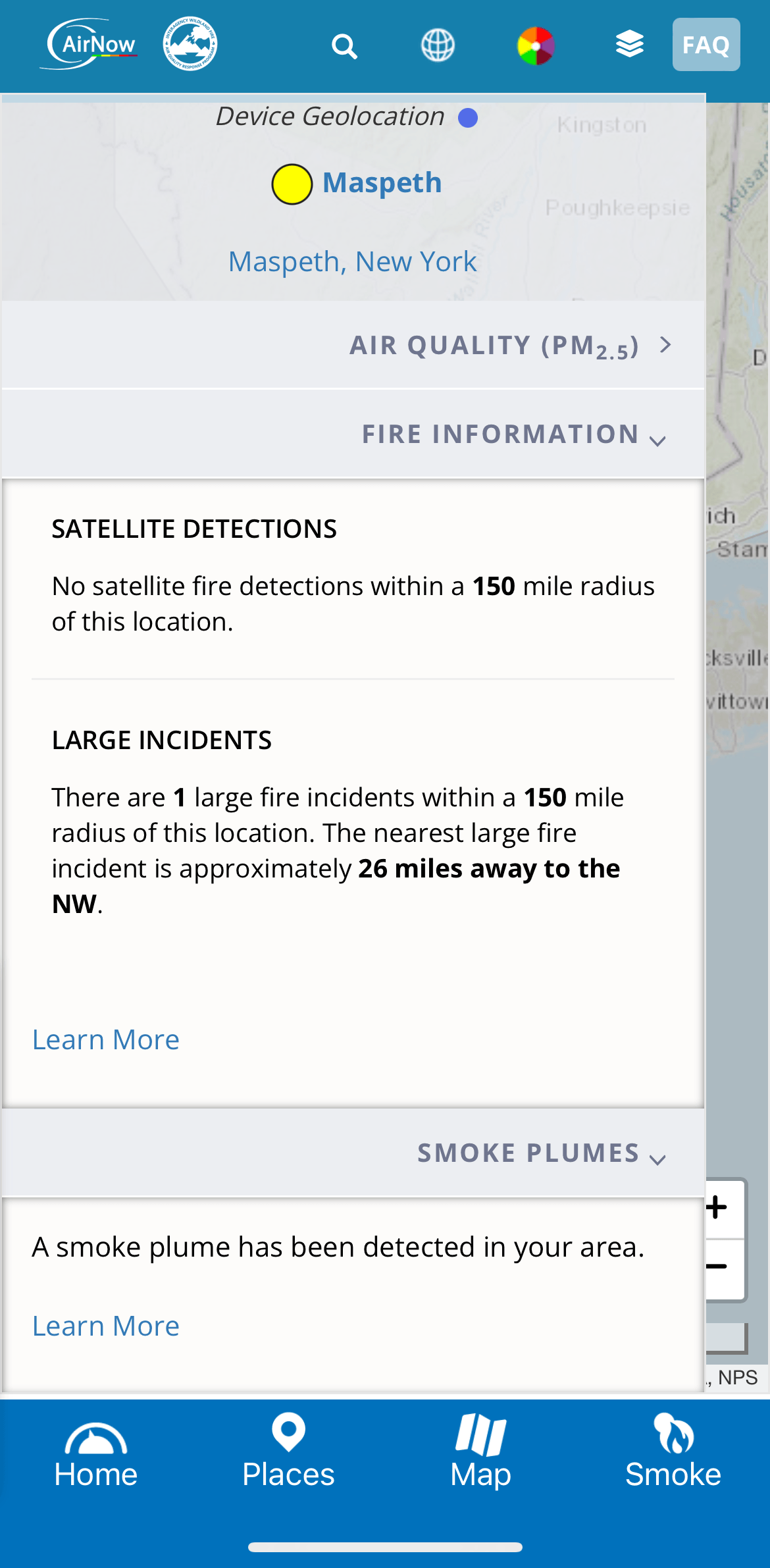 The AirNow app additionally has a “smoke” tab that shows a similar smoke plume overlay as MyRadar’s. By clicking on the globe in the upper left-hand corner, you can view additional fire information, including how far away the nearest burn is, and confirm if you’re under a smoke plume. Using these two pieces of information together, you can further deduce if the smoke you’re experiencing is blowing in from somewhere far away or nearby (some of New York’s smoke may be from the Cannon Ball 2 Fire to our northwest, in Passaic County, New Jersey, but the app shows me that fire is fairly small — 107 total acres — and so in this case, it is not the main culprit).