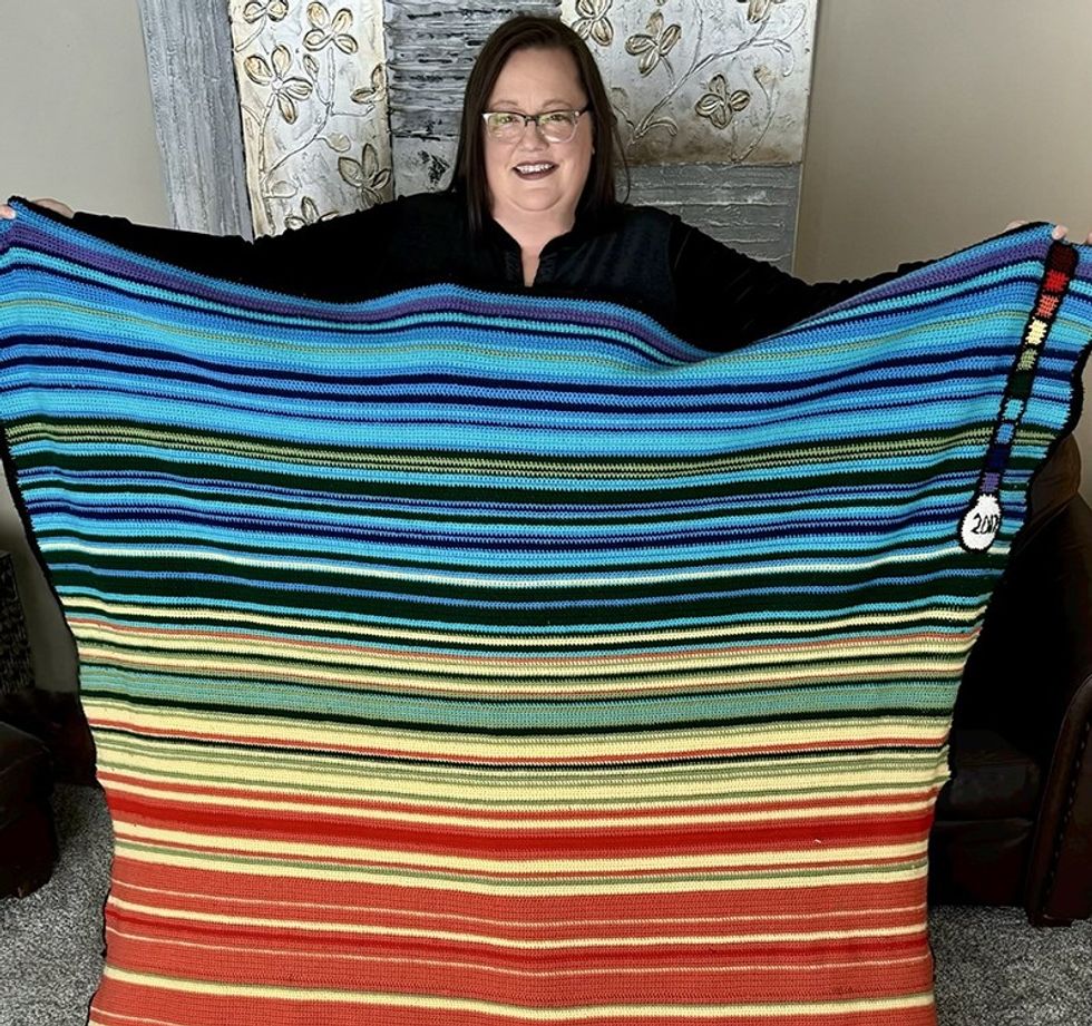 Messer, a retired educator of 30 years, started crocheting in 2022, the natural evolution of a knitting habit she’d picked up while bored during the pandemic. So far, she has made several scarves and hats, a big cardigan “almost like a coat,” and even a couple of throw blankets. Then, in January, she began work on her biggest project yet: a temperature blanket.