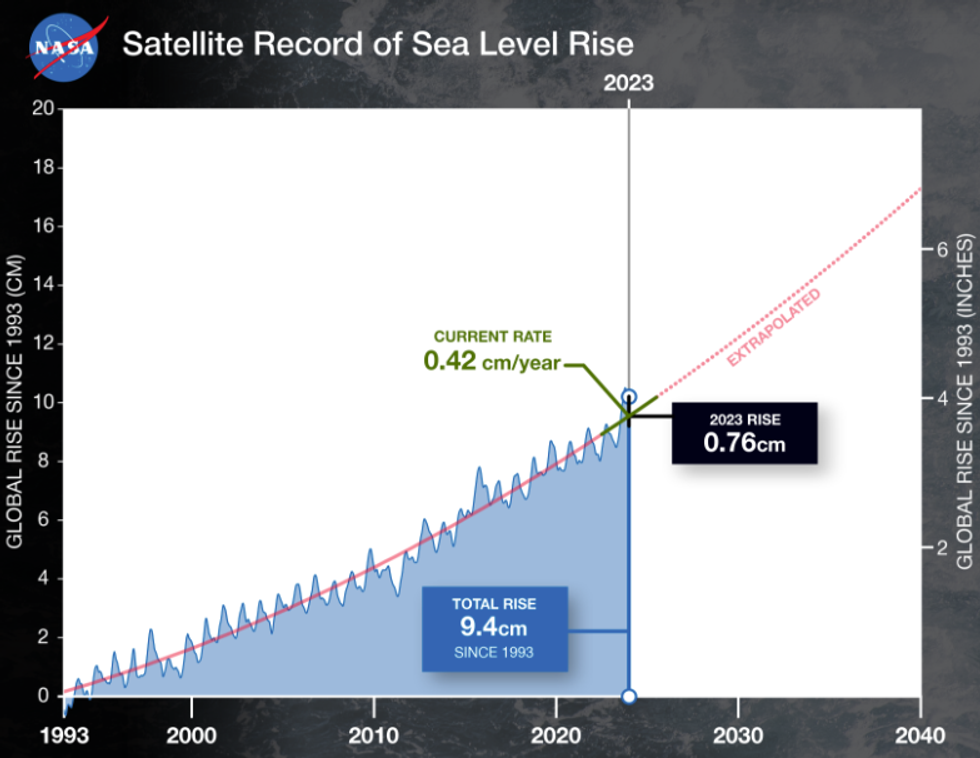 The global average sea level rose by about 0.3 inches between 2022 and 2023, according to NASA. This is a “relatively large jump,” the agency said, driven by climate change and El Niño. Since 1993, the global average sea level has risen by 4 inches and the rate of rise is accelerating. In 1993, sea levels rose by about .07 inches per year.