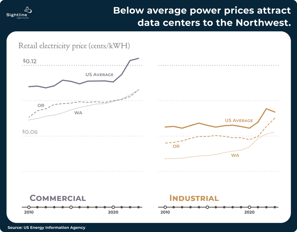 The Northwest has one of the country’s highest concentrations of data centers due to the region’s tax breaks — including low or no property taxes for many in Oregon and sales and use exemptions on equipment purchases and installations in Washington — as well as its below-average renewable power prices. But utilities “working across state lines could shift renewable resources to serve Northwest data centers, making up the difference by burning more coal and gas in places that lack strong environmental protections,” Emily Moore, the director of climate and energy at the sustainability think tank Sightline, writes in a new report.