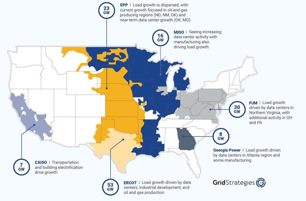 Over the next five years, American demand for electricity is set to grow by the equivalent of 15 times the peak demand of the entirety of New York City. That’s according to the latest annual forecast from the consultancy Grid Strategies. The growth — roughly sixfold what was forecast in 2022 — comes overwhelmingly from data centers, as shown by which regions expect the largest growth: