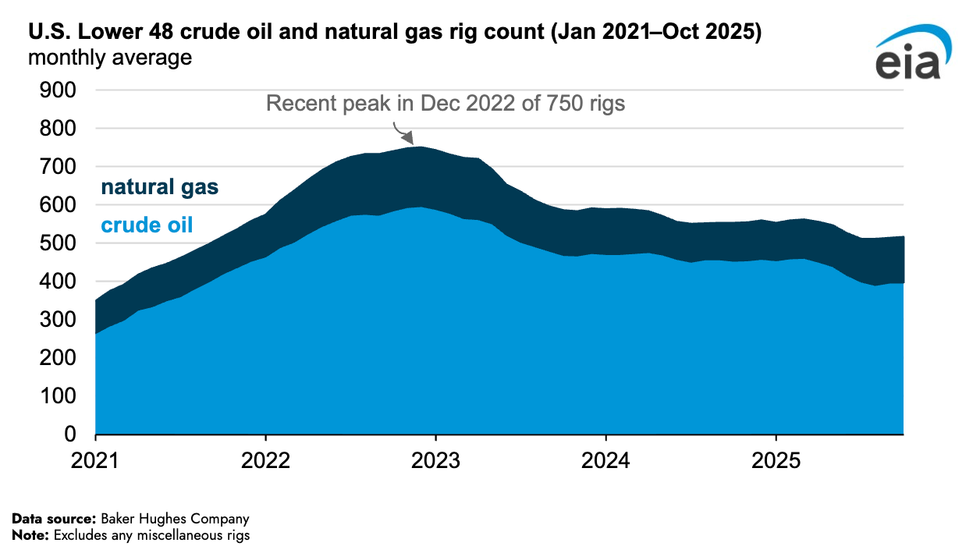 The average number of active rigs per month that are drilling for oil and natural gas in the continental United States fell steadily over the past year. As of last month, the U.S. had 517 rigs in operation, down from a peak of 750 in the end of 2022. The number of oil-pumping rigs dropped 33% to 397 rigs, while gas-pumping rigs slid 23% to 120 rigs over the same period from December 2022 to October 2025. While the Energy Information Administration said the declining rig count “reflects operators’ responses to declining crude oil and natural gas prices,” the federal research agency said it’s also “improvement in drilling efficiencies,” meaning companies are getting more fuel out of existing wells.