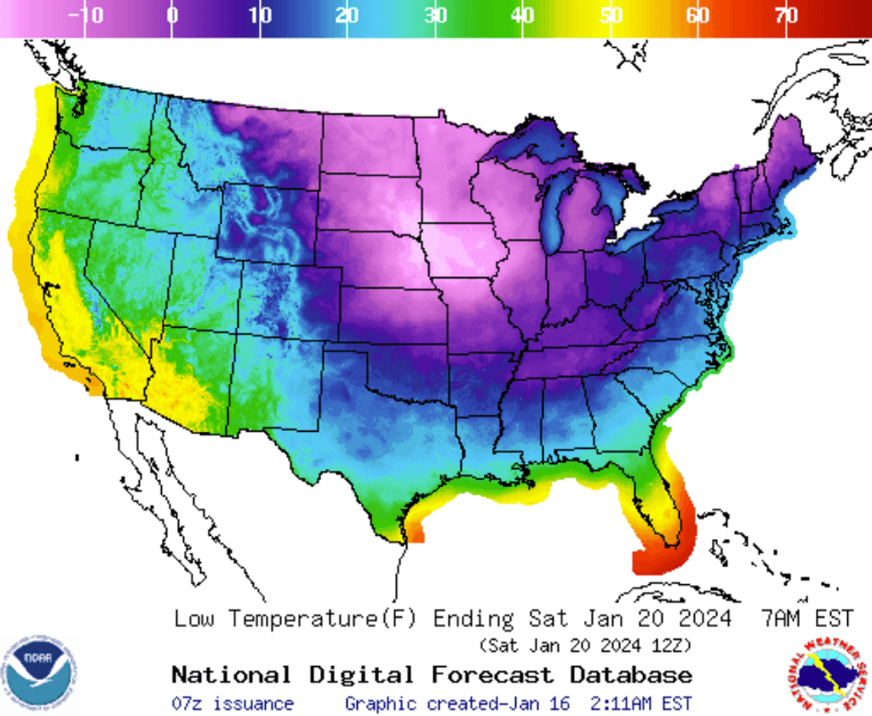 Half a million students in southern states have the day off as a dangerous cold snap forces school closures across Alabama, Arkansas, Tennessee, and Texas. ERCOT, which manages most of Texas’ electric load, has asked residents to conserve energy as the state faces wind chill advisories and hard freeze warnings. At least five deaths have so far been attributed to the severe winter weather. More than 70 million people across the country remain under winter weather alerts of some kind, and something like 250 daily cold temperature records are expected to be shattered today. Temperatures could warm slightly Wednesday but the National Weather Service expects another arctic blast to descend Thursday. Here's a look at the temperature lows currently forecast for Friday night: