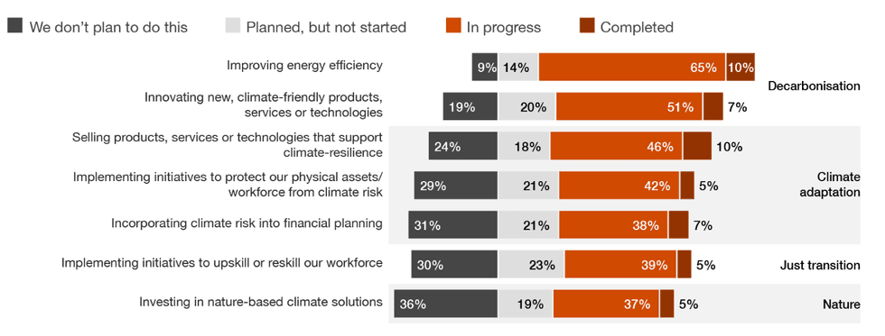 A growing number of company executives across the globe are worried their firms won’t survive the next 10 years unless they undergo a major overhaul, according to a survey of 4,700 CEOs conducted by consulting firm PricewaterhouseCoopers (PwC). About 45% of the respondents are concerned about their current business models, up from 39% on last year’s survey. Among their top anxieties are artificial intelligence and – you guessed it – climate change. Nearly one-third of CEOs say they expect climate change to “alter the way they create, deliver, and capture value over the next three years.” About two-thirds of respondents say their firms are improving their energy efficiency, but support is lacking for other climate-related company initiatives: