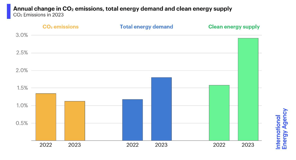 There’s bad news and good news in the International Energy Agency’s CO2 Emissions in 2023 report. Let’s start with the bad news, so we can end on a positive note. Energy-related carbon emissions are still going up. Emissions increased by 1.1% in 2023, largely due to hydropower shortfalls caused by drought. The sooner we can stop pumping new carbon into the atmosphere, the better our chances of avoiding the worst effects of climate change. But there are glimmers of hope in the report: Last year’s rise was less extreme than the year before even though energy demand growth accelerated, and “without clean energy technologies, the global increase in CO2 emissions in the last five years would have been three times larger.” And the report finds that between 2019 to 2023, clean energy growth was twice as large as fossil fuel growth.