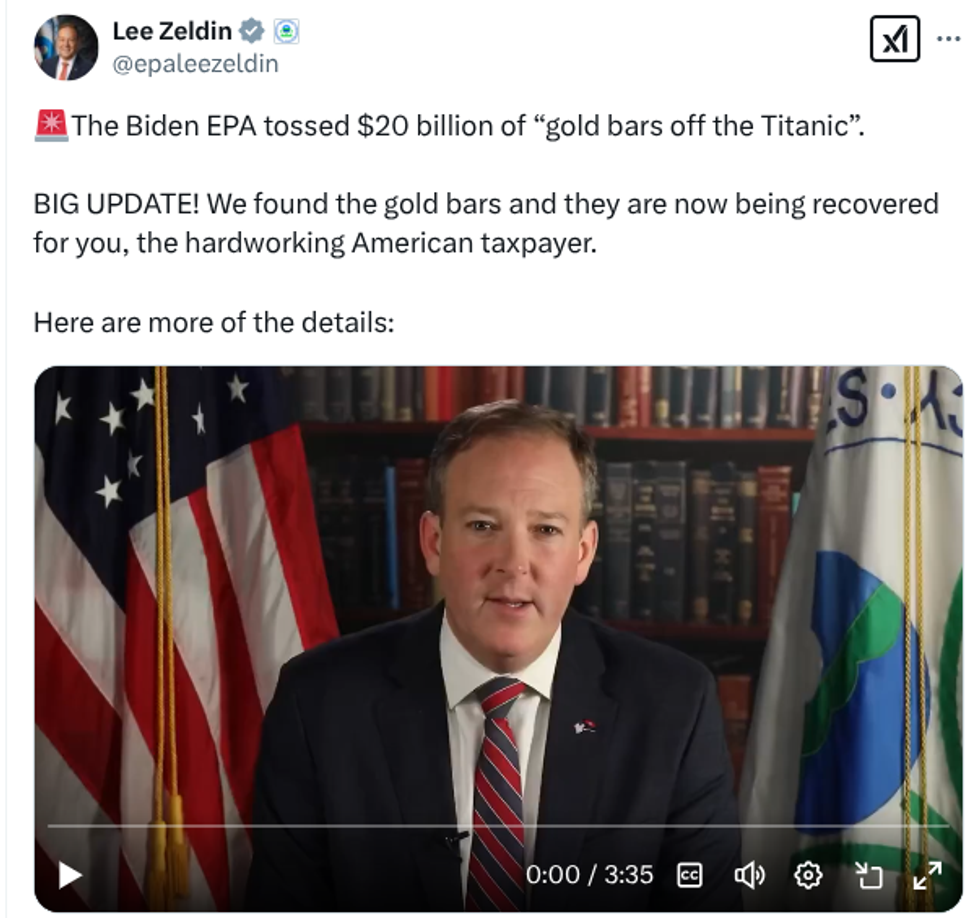 EPA Administrator Lee Zeldin says he plans to revoke $20 billion in grants awarded for Biden-era climate projects. In a video posted on X, Zeldin said the EPA would end its contract with the bank that oversees the Greenhouse Gas Reduction Fund, a $27 billion Inflation Reduction Act program for climate mitigation and adaptation initiatives. As Heatmap’s Emily Pontecorvo reported last year, the idea behind the fund was to “create a national clean financing network for clean energy and climate solutions.” The money has already been awarded to eight nonprofits, including the Coalition for Green Capital, Rewiring America, Habitat for Humanity, and Community Preservation Corporation. Zeldin seems intent on clawing the money back, accusing the Biden administration of rushing its distribution without oversight. “The financial agreement with the bank needs to be instantly terminated and the bank must immediately return all of the gold bars that the EPA toss off the Titanic,” he said. The move will likely draw legal challenges.