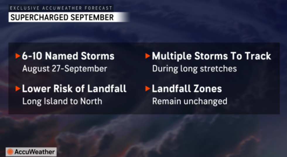Meteorologists from AccuWeather are warning about the potential for “back-to-back tropical threats” in the Atlantic in the coming weeks, forecasting up to 10 named storms between August 27 and September 30. The average for that time frame is six storms. The agency says dry air and Saharan dust have kept the Atlantic relatively quiet but that these conditions are lifting now. “With extremely warm water temperatures, less disruptive wind shear, and less dry air, we could see a storm organizing every few days,” said AccuWeather lead hurricane expert Alex DaSilva.