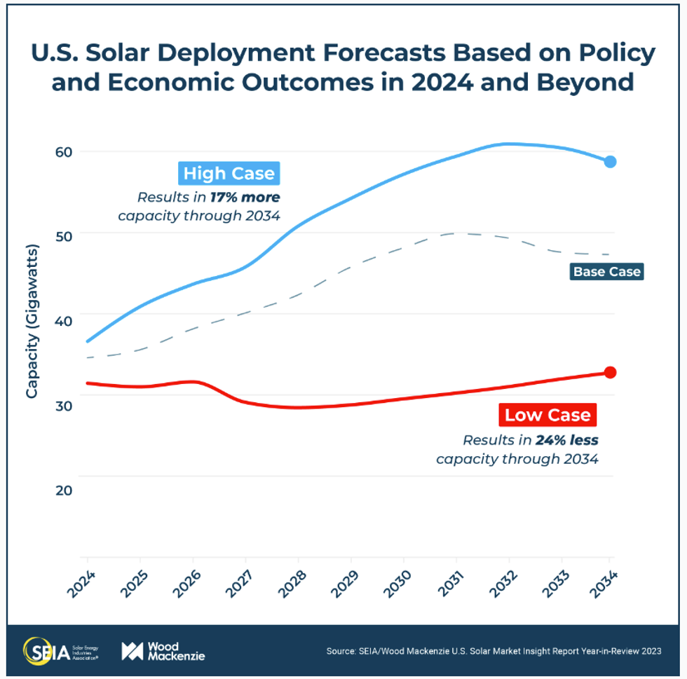 Solar installations in America hit a record-high last year, according to the U.S. Solar Market Insight 2023 Year in Review. The industry added 32.4 gigawatts of electric generating capacity, which is a 51% increase over 2022. Solar accounted for more than half (53%) of all new electric generating capacity, a first for renewable electricity. “If we stay the course with our federal clean energy policies, total solar deployment will quadruple over the next 10 years,” said SEIA president and CEO Abigail Ross Hopper. The report outlines solar deployment forecasts through 2034 based on different scenarios. Supply chain improvements, lower interest rates, and tax credits could increase installations; supply chain problems and unfavorable economic policies would hurt capacity:
