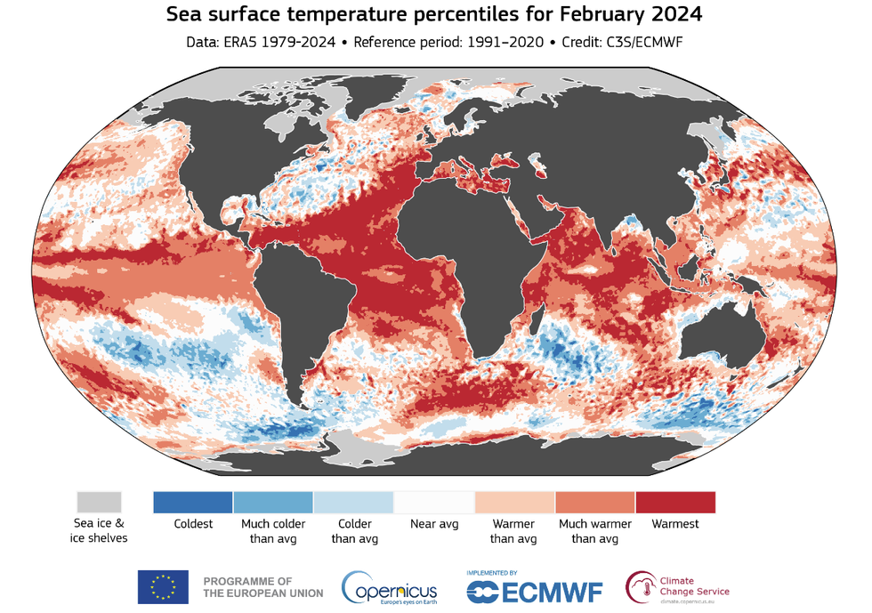 Last month was the warmest February ever recorded, the EU's Copernicus Climate Change Service said today. This marks the 9th record-breaking month in a row, and the effects were felt world wide. Temperatures in Europe, for example, were 5.9 degrees Fahrenheit above averages seen between 1991 and 2020. But even more startling was the ocean temperature, which was higher last month than it was last August.